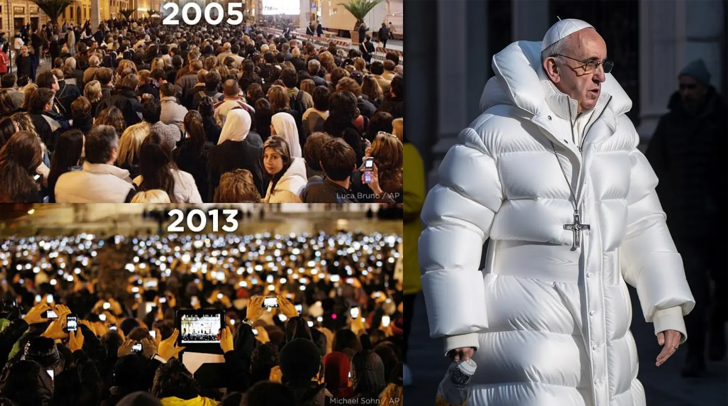The first two images are from the public announcements of two papal elections: Pope Benedict in 2005 and Pope Francis in 2013. In the span of just eight years, the crowd’s mode of seeing had visibly shifted – people were no longer simply present, but viewing the moment through the mediated filter of their cameras and phones. A decade later, the third image appears: Pope Francis in a white, Balenciaga-style puffer jacket. I deliberately refrain from writing seemingly shows, because what we are presented with is a photographic image. It looks exactly like one – the lighting is plausible, the resolution convincing, and there are no immediate signs of manipulation or glitch.